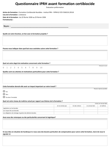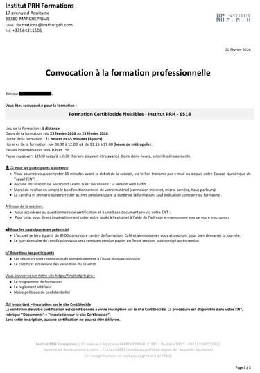 Dans les 5 jours qui suivent la validation de votre devis, vous recevez une convocation par mail, spécifiant les modalités de formation, mais surtout votre accés personnel à un espace numérique de travail. Sur cet espace, vous retrouverez le lien de connexion à la classe virtuelle (pour ceux ayant choisis la formation à distance), ainsi qu'un document (tuto) vous permettant de vous inscrire à la certification sur le site certibiocide du Ministère